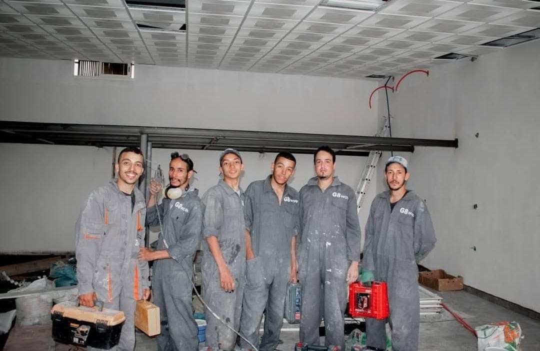 Travaux de rénovation et d’aménagement réalisés avec précision : électricité, plomberie, climatisation, plâtrerie, peinture, aluminium, verre trempé, réseaux et caméras, ainsi que des solutions décoratives modernes comme les plafonds Sky View et les tableaux décoratifs muraux.